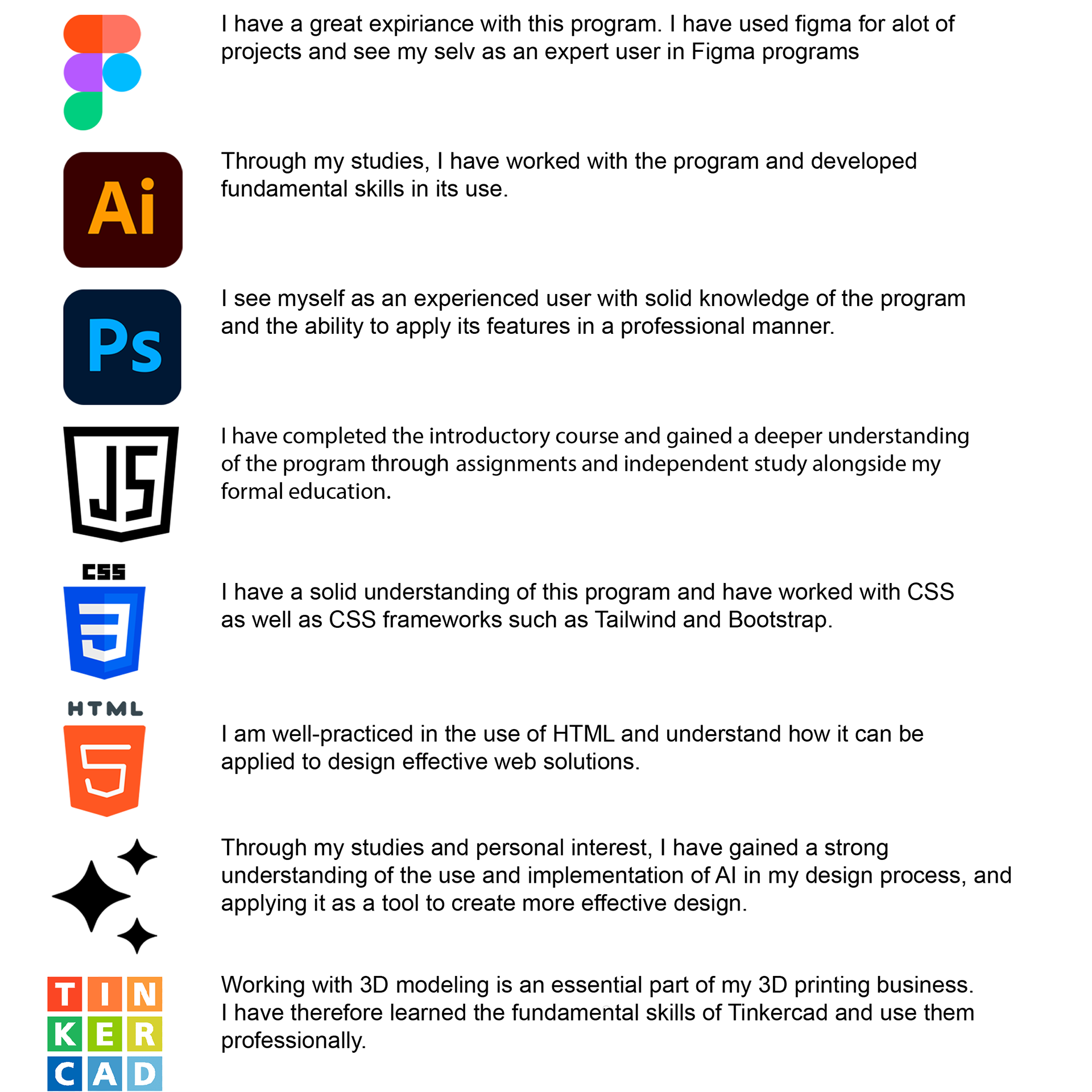 In addition to my current studies, I have a background in teaching with English and Social Studies as my main subjects. Between my teacher training and my current education, I worked in retail as a department specialist.
